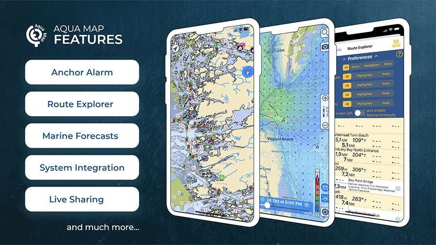 Aqua Map - A marine navigation app designed for smartphones and tablets. It features up-to-date nautical charts, POI displays from ActiveCaptain and Waterway Guide, marine forecasts, AIS target tracking, and Live Sharing.