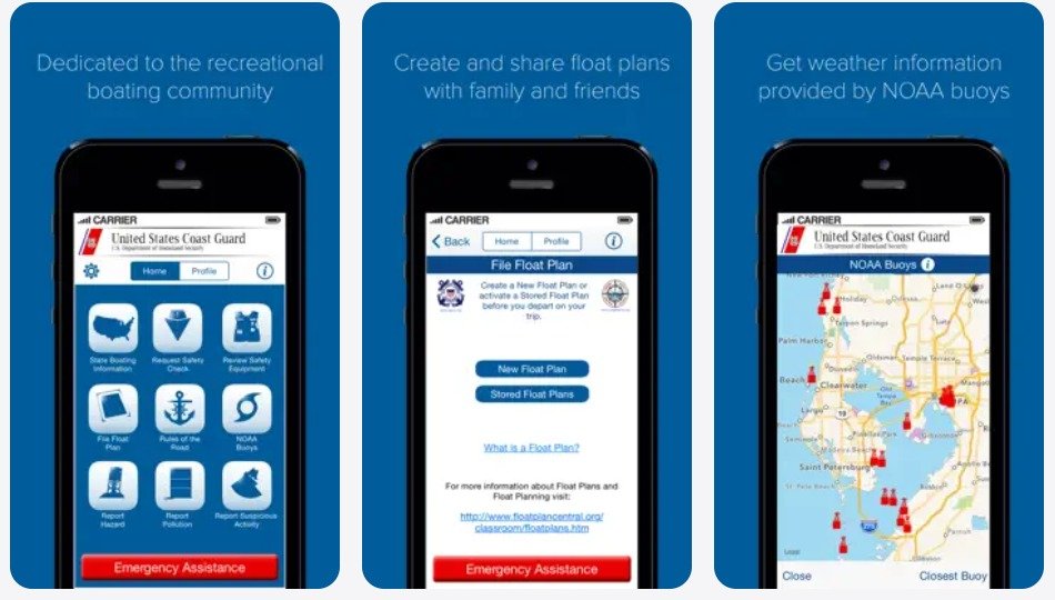 The U.S. Coast Guard Mobile App | Features of the app include: state boating information; a safety equipment checklist; free boating safety check requests; navigation rules; float plans; and calling features to report pollution or suspicious activity.